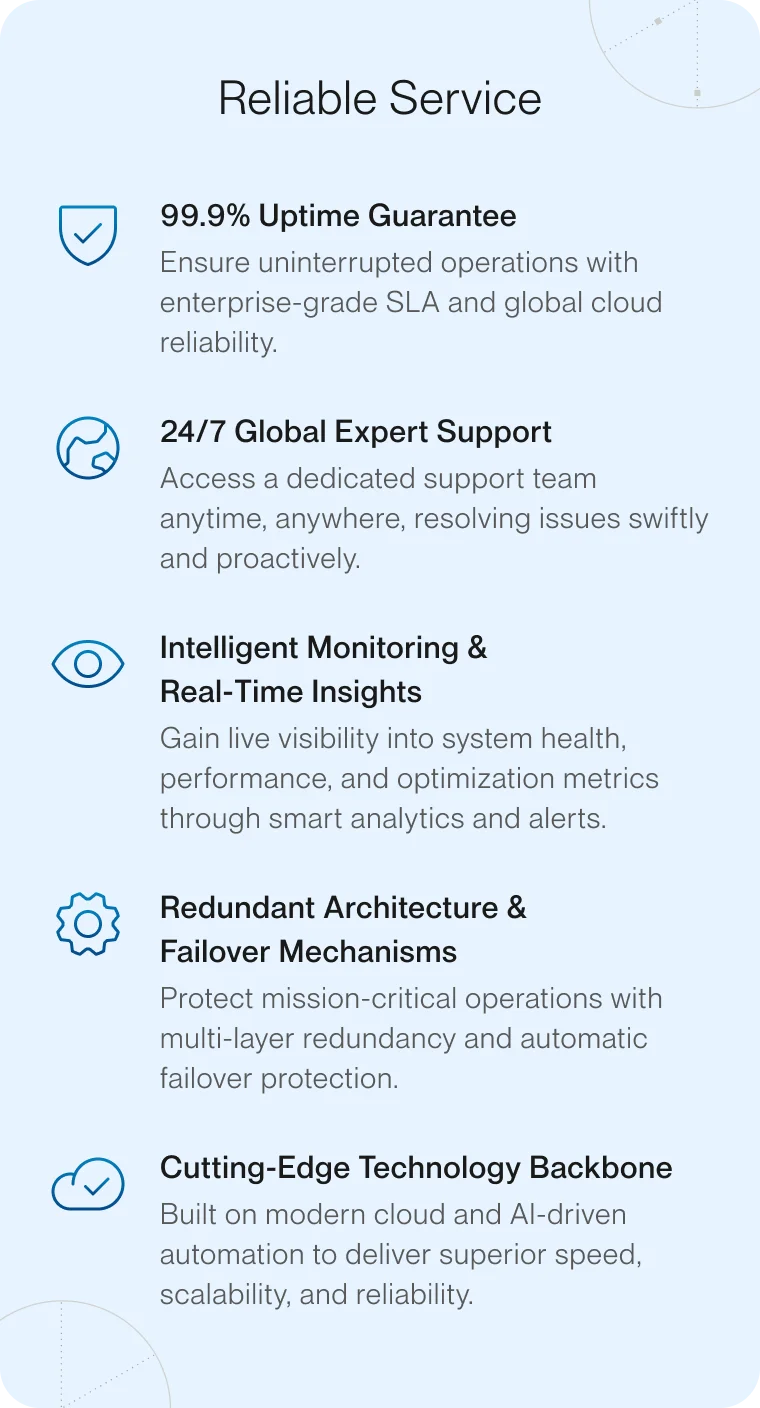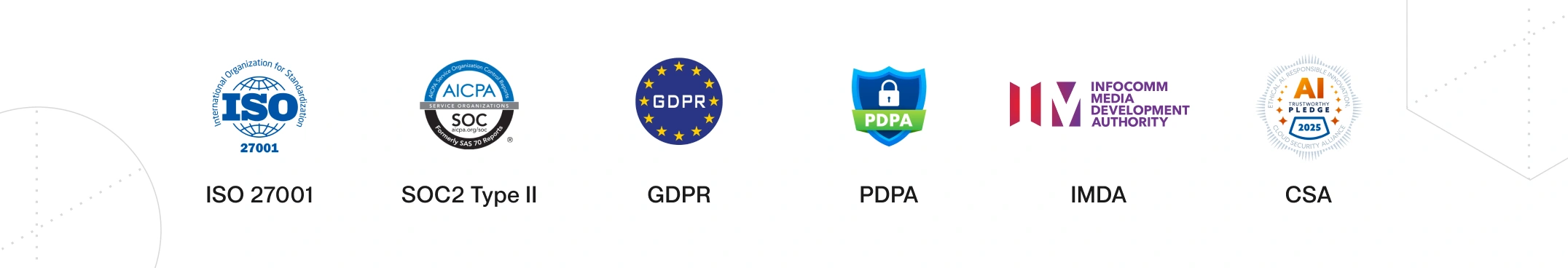 AI Rudder's infrastructure meets leading international standards, including SOC 2, ISO 27001, GDPR, PDPA, IMDA, and CSA, ensuring full compliance and continuous protection.