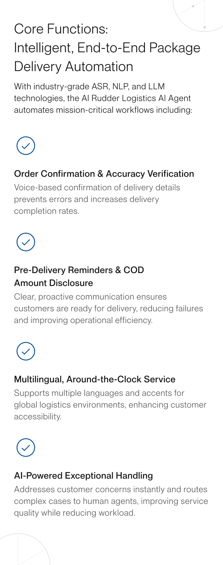 Before dispatching goods, the robot makes outbound calls to confirm customer availability (e.g., whether they are at home, preferred payment methods), reducing "ineffective deliveries" (e.g., missed pickups) and associated repeated transportation costs.