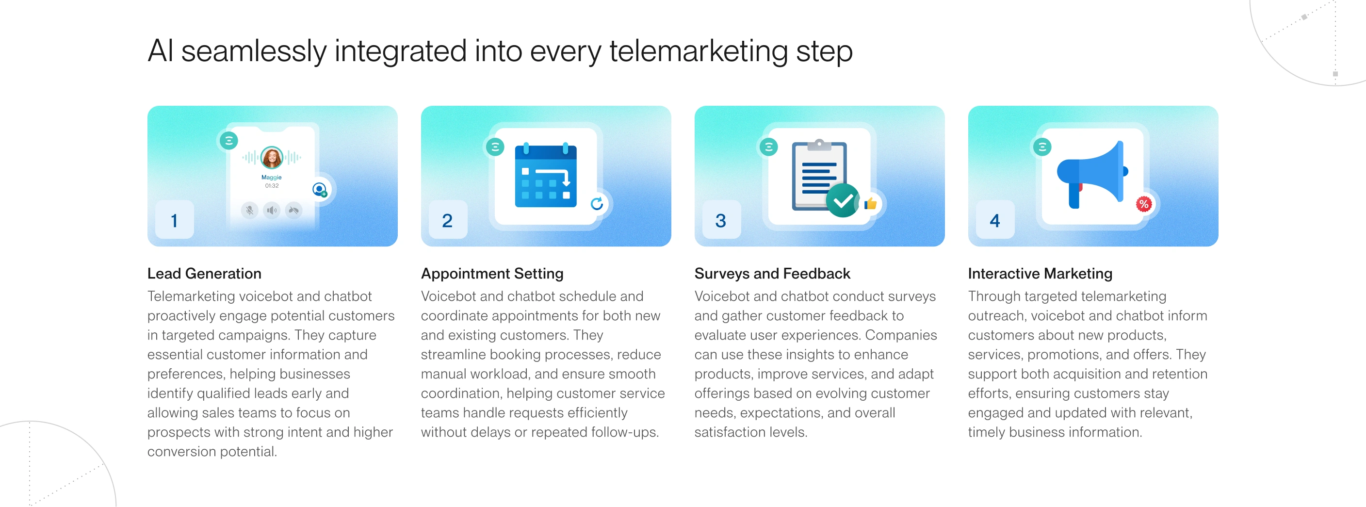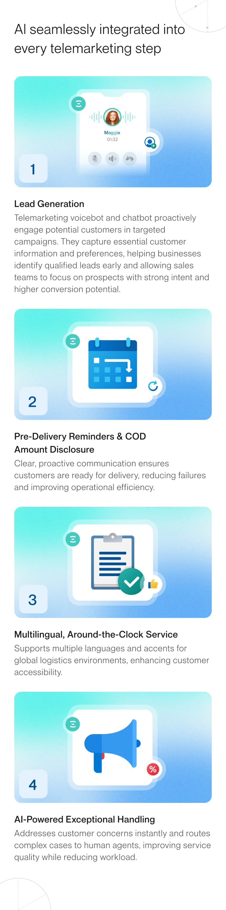 All conversations follow approved telemarketing scripts with complete logs and auditability, reducing compliance and operational risks.